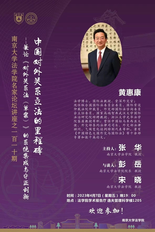 4月8日晚,联合国国际法委员会委员、外交部国际法专家咨询委员主任委员、国家高端智库武汉大学国际法治研究院特聘教授、原中国驻马来西亚特命全权大使黄惠康在色情网站 学术报告厅作了主题为“新中国对外关系法...