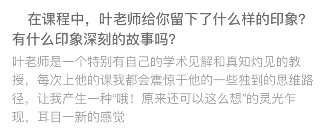 A:我们同学比我想象的更腼腆。其实我希望同学们能够更加自由地表达自己的思想,更多地和老师进行交流。对同学而言,直接交流更有意义。对老师来说,也能知道学生的状态,相应地去进行调整。所以同学们可以和老师有更多联系,不用有什么顾忌,大胆表达自己的思想。