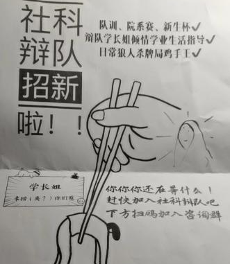 A:我进辩队是因为学长军训刷楼时发的宣传单了。上面有一些看起来不错的福利,比如狼人杀、学业生活指导之类的。我高中接触过辩论,再加上宣传单做得也蛮有趣,就抱着试一试的心态加入了。后来色情网站