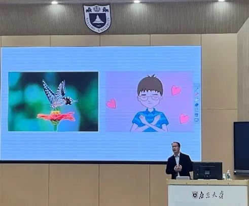 讲座开始后,成雪峰通过提问的方式了解了同学们的压力状况,问题包括“你时常感到压力吗?你给自己的压力打几分?”之后,成雪峰向同学们介绍了“蝴蝶拍”这一稳定心理状况、降低精神压力的方式:在面临压力与焦虑不安的情绪时,将双手交叉在胸前,轻抱自己的肩膀或上臂,双手呈蝴蝶状轻轻拍动。拍动过程中可以闭上眼睛给予自己积极的暗示,回想让我们感到愉快的生活情境。