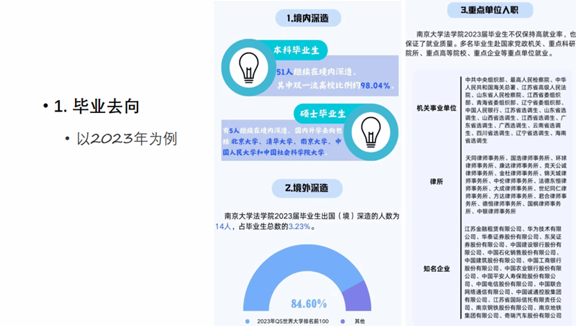 接着,她重点介绍了大家非常关心的保研与就业情况。通过纵横向对比,分析了南大法学专业的保研率;通过展示“南大就业”公众号上的数据,简略介绍了南大法学专业的毕业去向和未来可能。更进一步,学姐向大一新生们着重介绍了法学专业多元的就业领域与具体职业,尤其对律师、公务员体系、企业法务这三类最经典的法学就业出路进行了详细的剖析,分析了各自在工作强度、薪资水平、职业发展前景等等方面的情况。