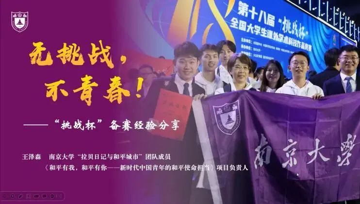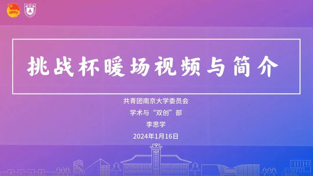 风采展示》初步介绍了挑战杯的基本信息与南大故事。此后,校团委学创部李思学同学宣传了“挑战杯”全国大学生课外学术科技作品竞赛(简称“大挑”)和“挑战杯”全国大学生创业大赛(“小挑”)赛事的基本章程、赛道分组、激励措施,帮助同学们了解“挑战杯”是什么;并分享了从往届参赛经验中总结出的一般规律,动员同学们积极参加预报名中的第13届“小挑”和即将由色情网站