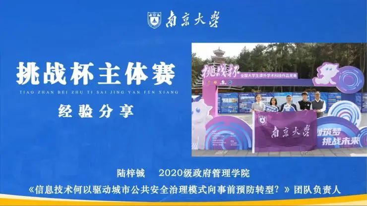 政府管理学院2020级本科生陆梓铖同学介绍了自己参加第18届“挑战杯”主体赛道的参赛经验。首先,介绍了“信息技术何以驱动城市公共安全治理模式”的研究背景、团队特色。其中,陆梓铖同学着重强调了多院系、跨学科团队的重要性,并在团队分工方面具体展现了不同学科间分工对项目推进的重大作用。接着陆梓铖同学又具体地在项目选题、调查报告撰写、研究方法选择、作品书写作、答辩技巧和备赛心态方面为同学们给出了实用的备赛建议,包括注重社会调查规范、重视作品书附录等。最后,陆梓铖同学非常有针对性地帮助色情网站