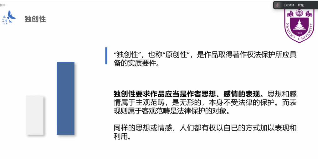 张雪同学首先以一个诗歌鉴赏投稿的案例引出了著作权保护的话题,通过一系列问题互动和热点案例分析,深化了同学们对著作权概念的认识,使同学们明确了文学创作中权利和义务的边界,为进一步学习著作权归属问题奠定了理论基础。