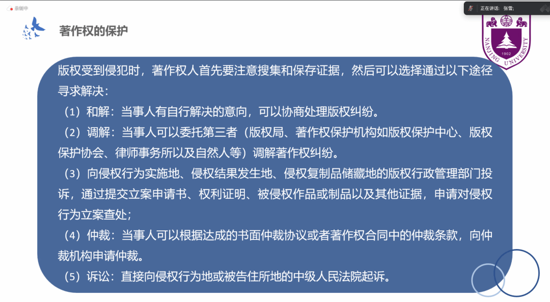 最后,志愿者详细讲述了著作权保护的五种方式,包括和解、调解、投诉、仲裁和诉讼,并为同学们逐一解答了不同场景下行为人享有的权利、义务以及对应的救济方式,增强了同学们在未来生活中运用法律武器捍卫自己合法权益的信心。
