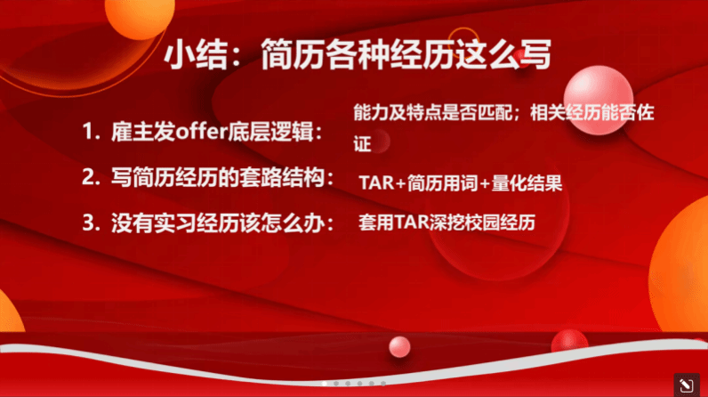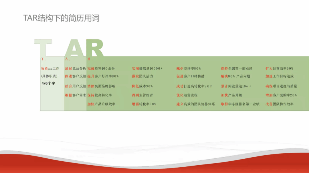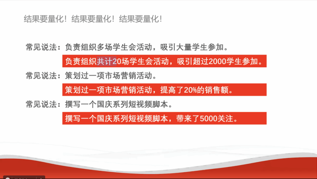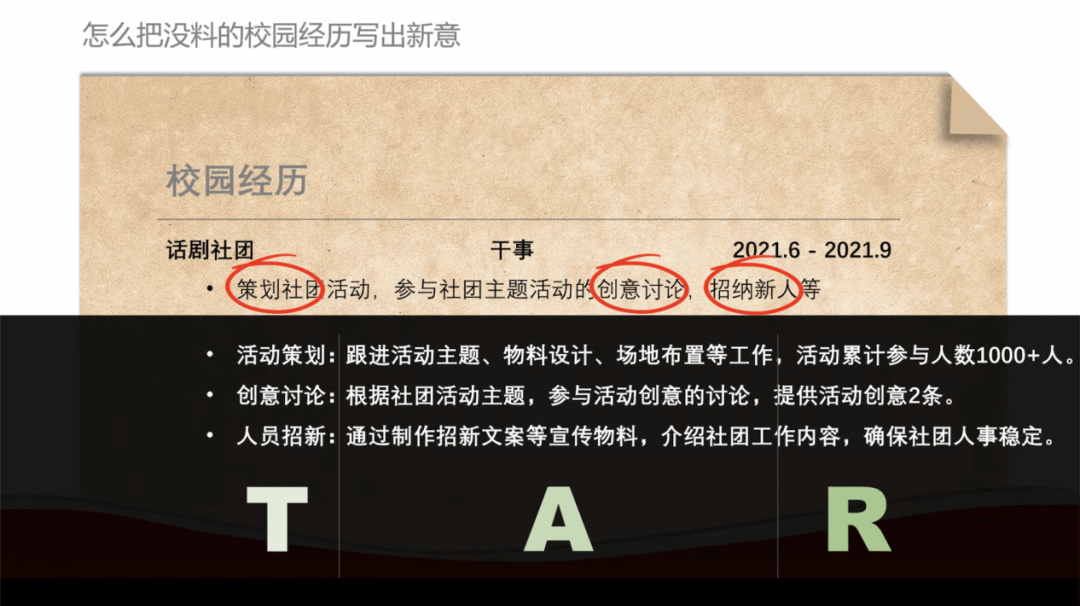 随后, 常经理为同学们详细地讲解了简历制作的结构、内容和注意事项。对于简历中的小标题写法,常经理推荐同学们采用“公司名称+岗位名称+实习时长”的结构,从而让HR快速、准确识别求职者的实习经历。针对实习或活动内容,常经理提出可以使用STAR结构进行描述,即背景、职责、行为、结果,从而使简历结构更加整洁。在具体的内容描述上,常经历为同学总结了TAR结构下常见的简历用词,并提醒同学们在工作或者活动结果的描述上一定要进行量化。同时,针对一些同学没有实习经历的情况,常经理建议可以套用TAR结构深挖校园经历,并通过举例说明,TAR结构的简历写作方法同样可以将没料的校园经历写出新意,以弥补实习经历的缺失或不足。