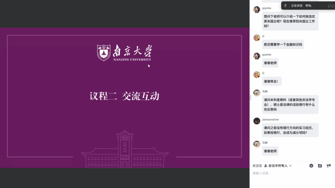 在交流互动环节,同学们踊跃参与,纷纷提出自己在简历制作、实习经历、职业选择等方面的问题。针对同学们的提问,马书记和常经理作出了详细的解答。对于大多数同学关注的实习经历问题,常经理建议同学们以“前期多尝试”+“后期重聚焦”的方式开展实习,在不同领域、不同方向的专业实习中找寻个人兴趣、锚定职业方向。除此之外,对一些同学提出的专业与目标岗位不匹配的担忧,常经理也作出解答,她认为,同学在求职过程中可以发挥自己专业优势,让自己成为复合型人才,扩大自己在求职中的竞争优势。
