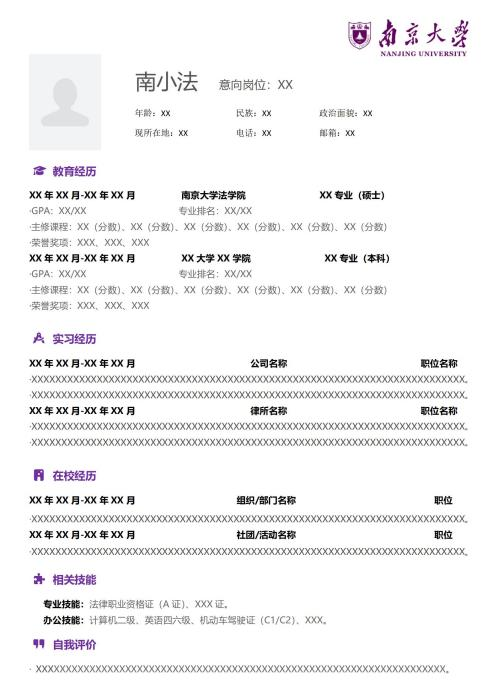 企业类简历的主要应用场景为国央企、民企、外企等企业的法务岗和综合管理岗。该类简历应当突出相关的实习经历,同时呈现教育背景、实践经历、荣誉奖励等内容,展示个人的综合素养与能力。