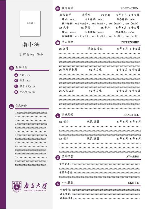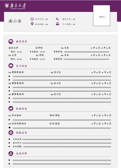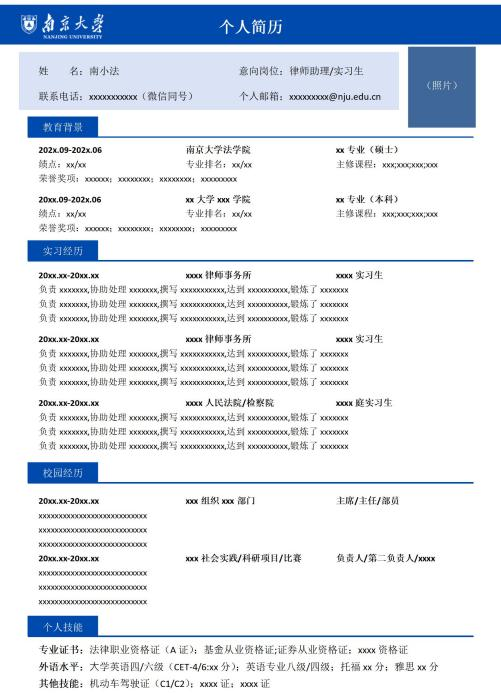 相比于政务类、升学类简历,律所类简历更应当突出与实务相关的实习经历;社会实践、科研经历、学生工作等内容若与所申请的执业方向高度相关,可适当详细说明,否则略写即可。