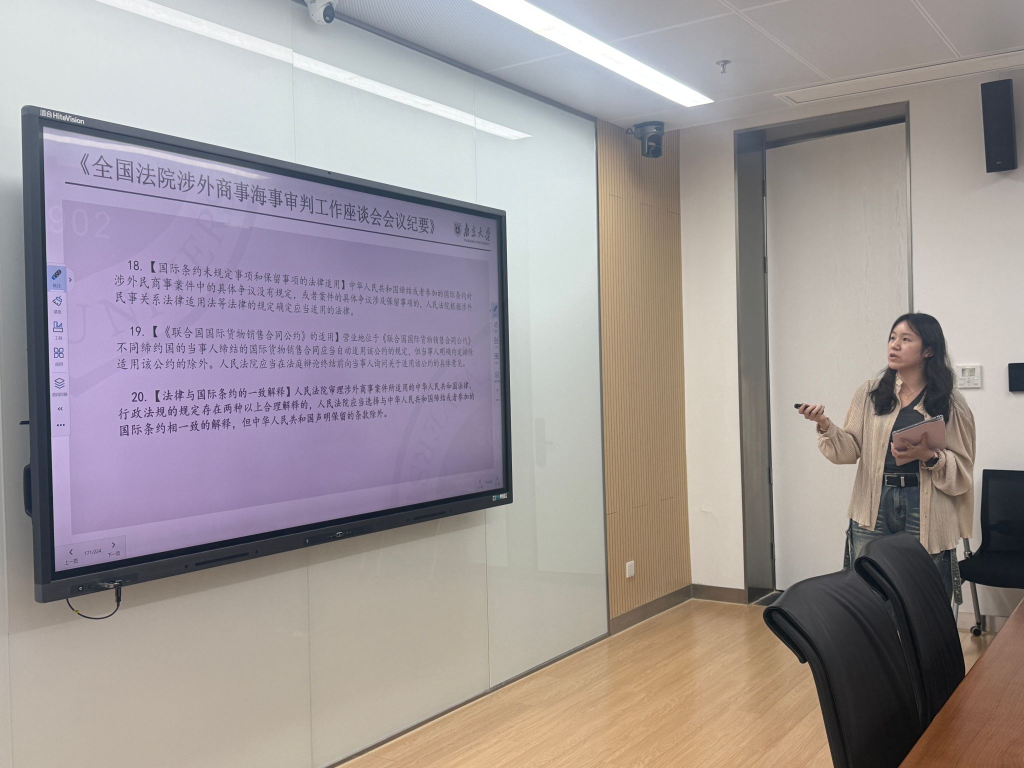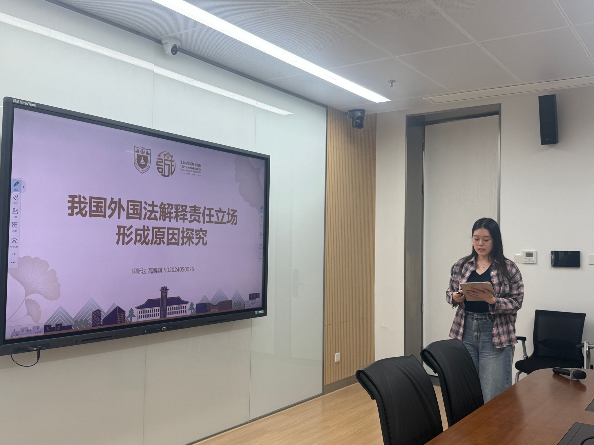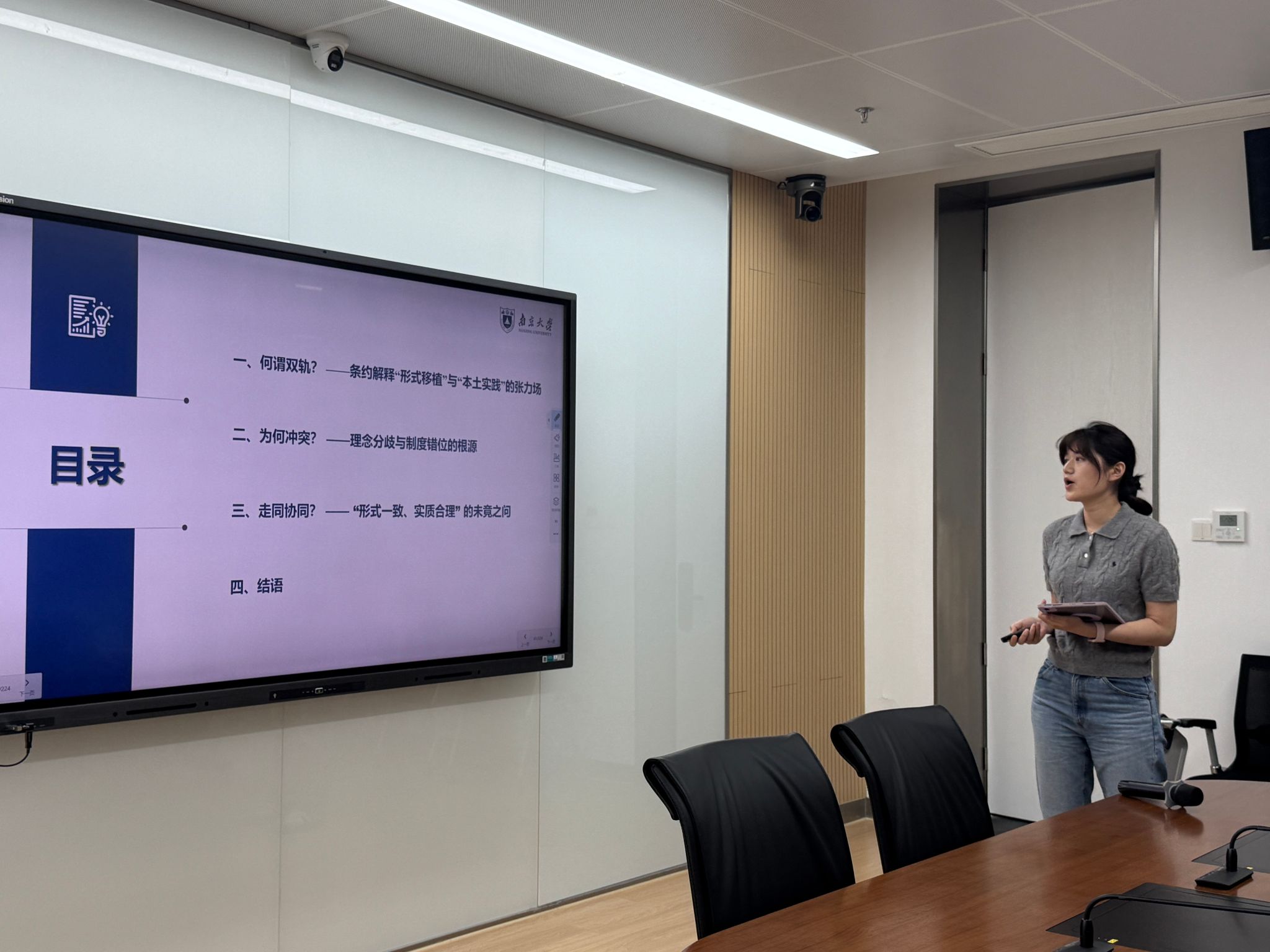 李湉湉同学做题为“我国条约解释中一致解释原则的适用机制分析与路径完善”的汇报,围绕我国条约解释中一致解释原则展开,先指出其在适用范围、与司法遵从原则冲突等方面的现实困境,再阐述适用机制,包括国际条约无直接适用效力、国内法存在两种以上合理解释且其中一种与条约一致、存在阻却要件等,最后从三方面提出路径完善建议。