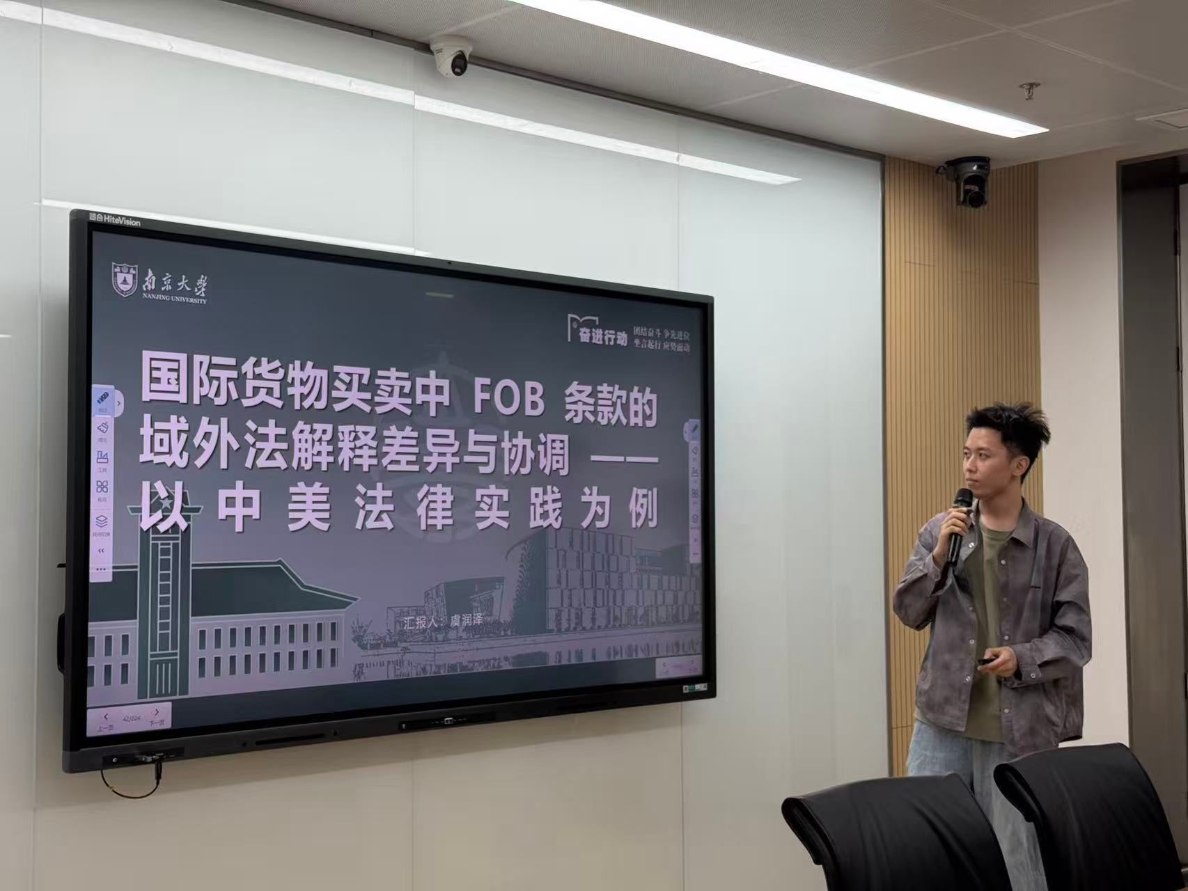 虞润泽同学做题为“中国法院对FOB术语风险转移的域外法解释争议——以中美法律对比为例”的汇报,汇报内容主要分为三个部分:首先,依据《海商法》第46条与美国《统一商法典》2-319条分析中美两国对FOB条款解释的核心差异;其次,虞润泽同学指出中美两国的争议焦点;最后,从建立法律适用的协调机制解决解释争议。