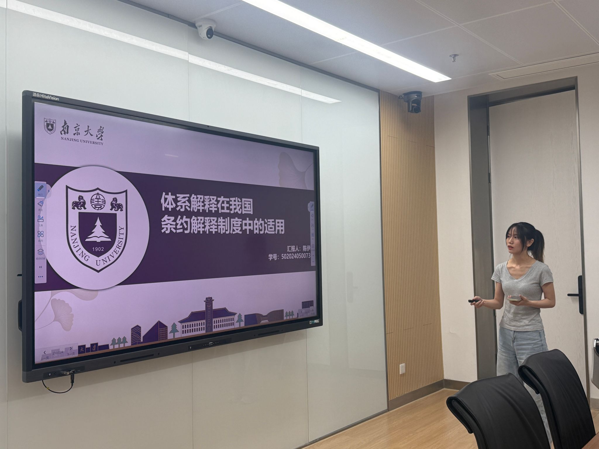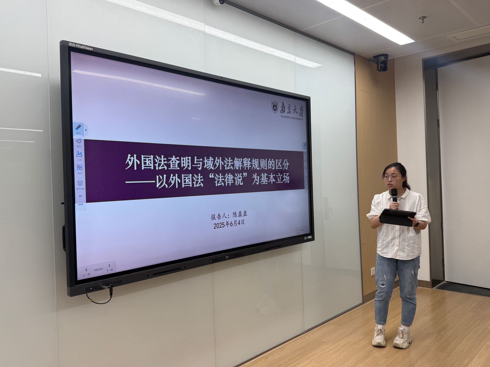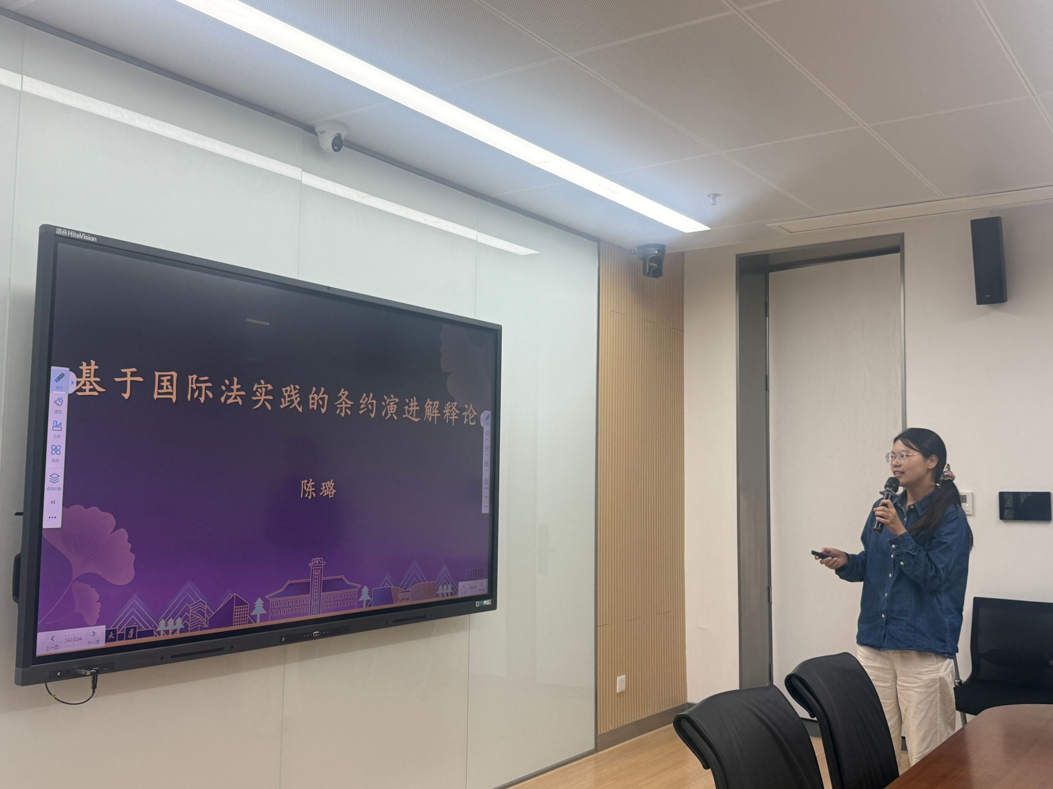 陈伊同学做题为“体系解释方法在我国条约解释制度中的适用”的汇报,围绕体系解释在我国条约解释制度中的适用展开,先介绍我国条约解释规则及《维也纳条约法公约》第31条内容,再阐述体系解释的定义及以融贯性为核心的三层次表现,接着分析国际法碎片化及条约体系解释的作用,最后说明条约体系解释方法在我国的适用路径与范围。