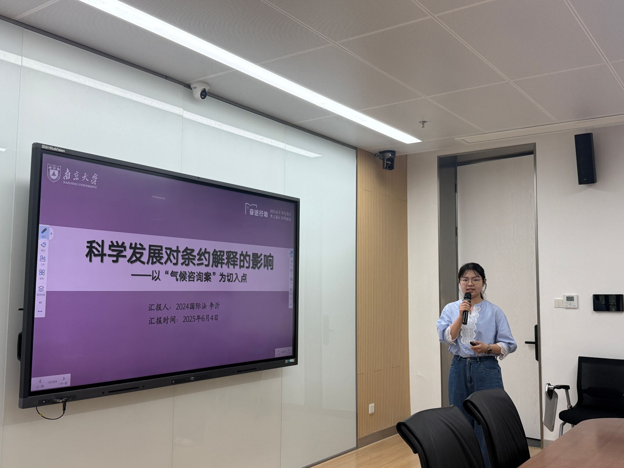 李沂同学做题为“科学发展对条约解释的影响——以‘气候咨询’案为切入视角”的汇报,以“气候咨询案”为切入点,探讨科学发展对条约解释的影响。先介绍案件背景、争议焦点及问题构造特点,再阐述《联合国海洋法公约》解释规则与方法,接着分析法庭在解释中对科学信息的使用,最后指出科学发展运用于解释规则和方法中产生的问题。