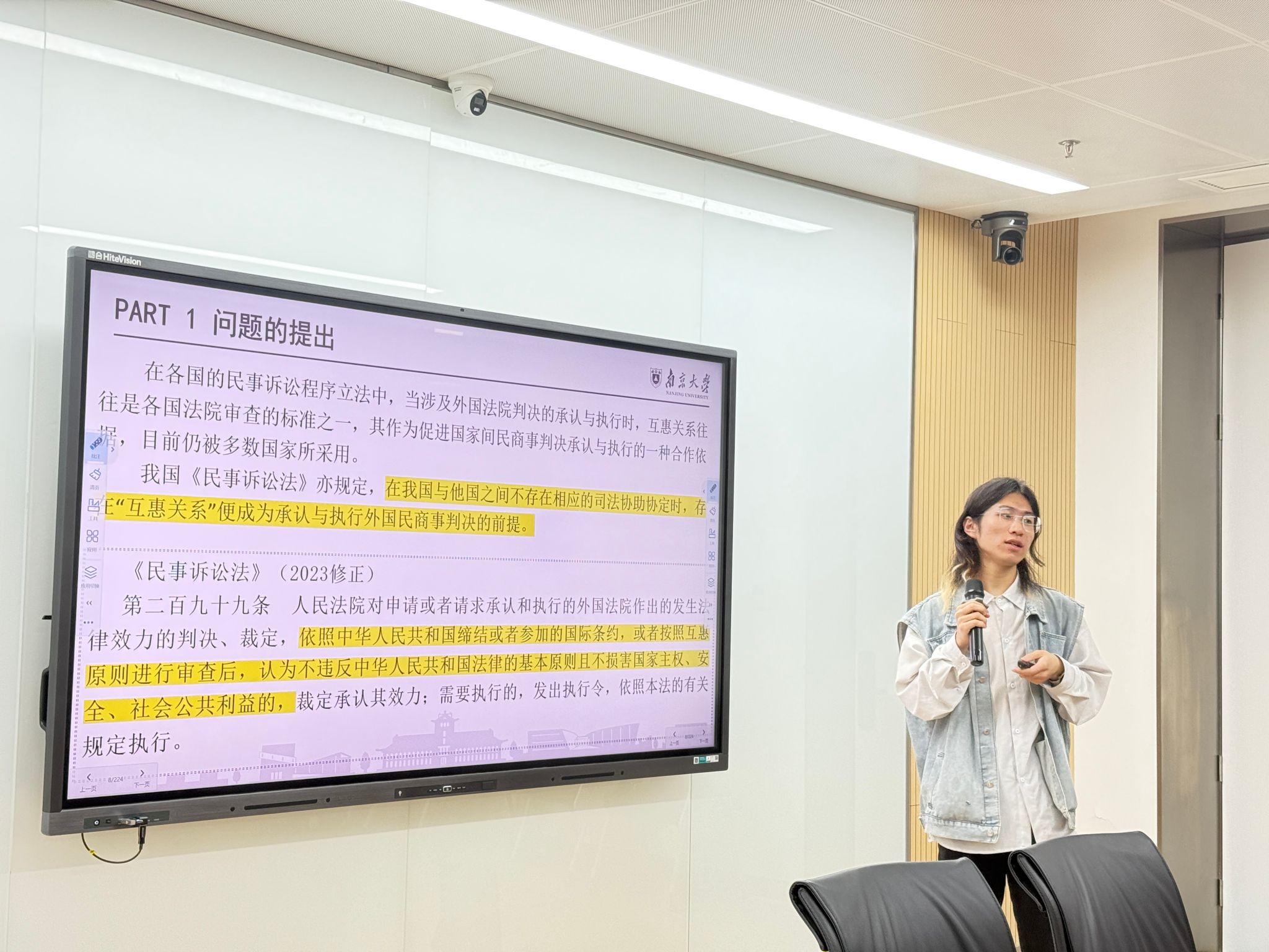 高昕然同学做题为“冲突法视角下域外法‘实质接受’解释路径的适用基础”的汇报,汇报主要分为三个部分:首先,对域外法“形式接受”解释路径进行了反思;其次,对域外法“实质接受”解释路径反对说进行了回应;最后,从合法性审查和和目的性审查两个角度对域外法“实质接受”解释路径进行合理性审查。