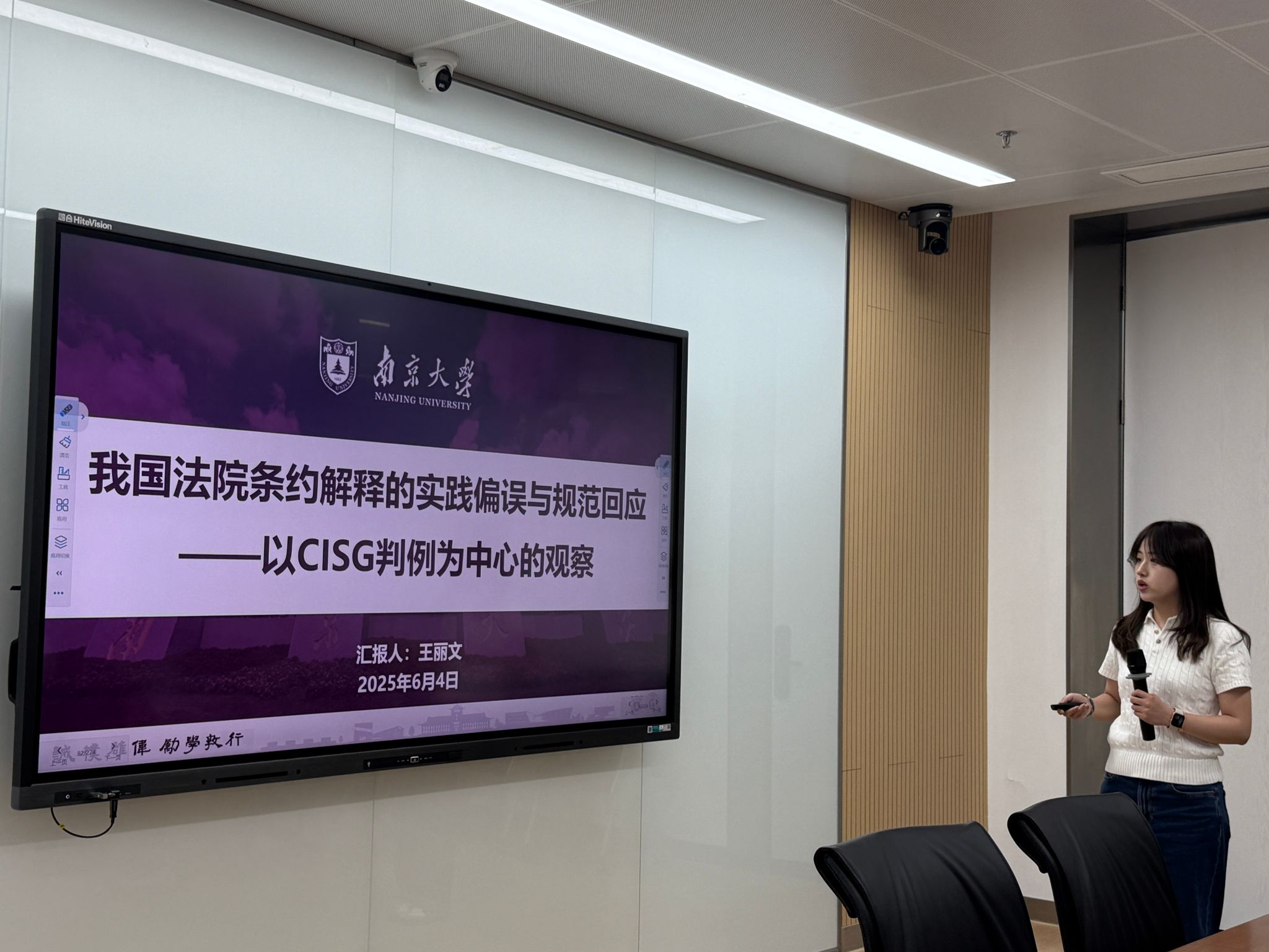 王丽文同学做题为“我国法院条约解释的实践偏误与规范回应——以CISG判例为中心的观察”的汇报,围绕我国法院条约解释实践,以CISG判例为中心,指出《民法通则》第142条废止后的制度真空及《条约解释》出台的意义,分析法院在解释条约时存在的三类偏误,探讨规范回应局限,最后从三方面提出规则构建方向。