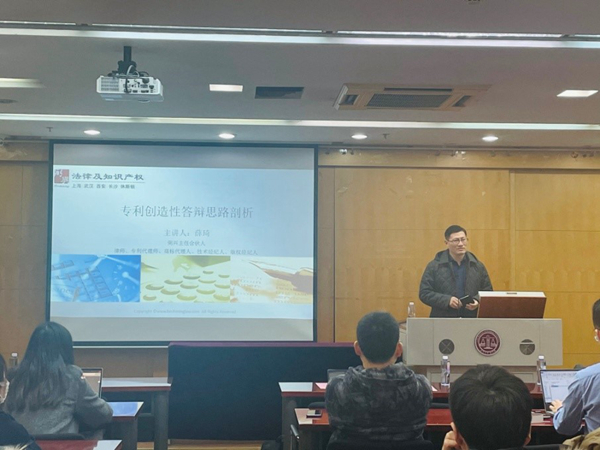 讲座中薛琦律师介绍了专利创造性的概念,说明了创造性的重要意义,并给出了专利申请中创造性的答辩思路。薛律师阐释了创造性的法律溯源,并介绍了创造性的三步判断方法、所属技术领域人员、显著进步的概念、实用新型和发明创造判断标准的差异。薛律师还详细讲解了实务中应对专利申请针对创造性答辩的处理步骤和技巧。交流提问环节,薛律师详细而专业地回答了同学们的提问,解答了同学们在知识产权法领域的困惑。