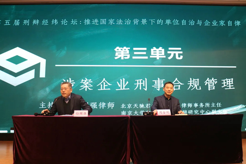 第三单元主题为“涉案企业刑事合规管理”,由北京天驰君泰(南京)律师事务所主任孙国强律师主持。江苏省人民检察院第四检察部蔡翠英副主任,南京森林警察学院企业犯罪防控与刑事合规研究中心副主任庆海涛教授,江苏省张家港市人民检察院吴晓敏副检察长,南京市雨花台区检察院一部周朝阳主任进行发言报告。盐城市建湖检察院检察长征汉年博士、江苏瑞格律师事务所主任周金刚博士围绕报告内容与谈交流。