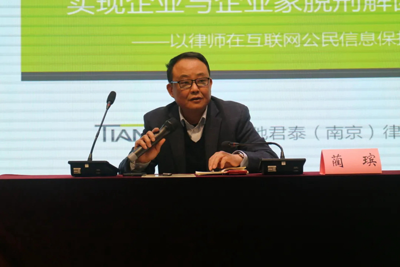 本单元第三位发言人北京天驰君泰(南京)律师事务所方士明律师发表了题为 “突出领域因人因事实现企业(家)脱刑解困——以互联网公民信息保护合规为切入点”的演讲。