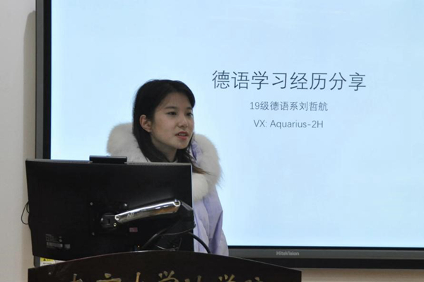 刘哲航同学分享了她学习德语的方法,强调外语学习要注重听说读写四个方面,多说多练,语言学习是一个循序渐进的过程,她也向同学们推荐了不少德语学习资源。
