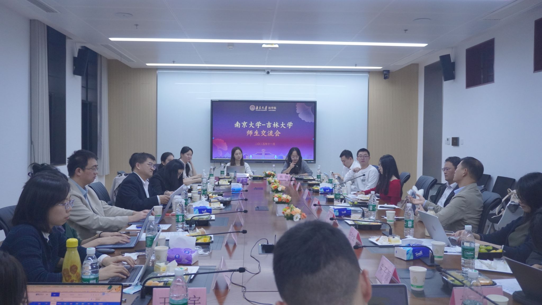 院长、教授彭岳、教授张华、助理研究员王倩慧及两院博士生代表参与交流,围绕学科发展、涉外法治人才培养、学术研究等议题进行了深入研讨。