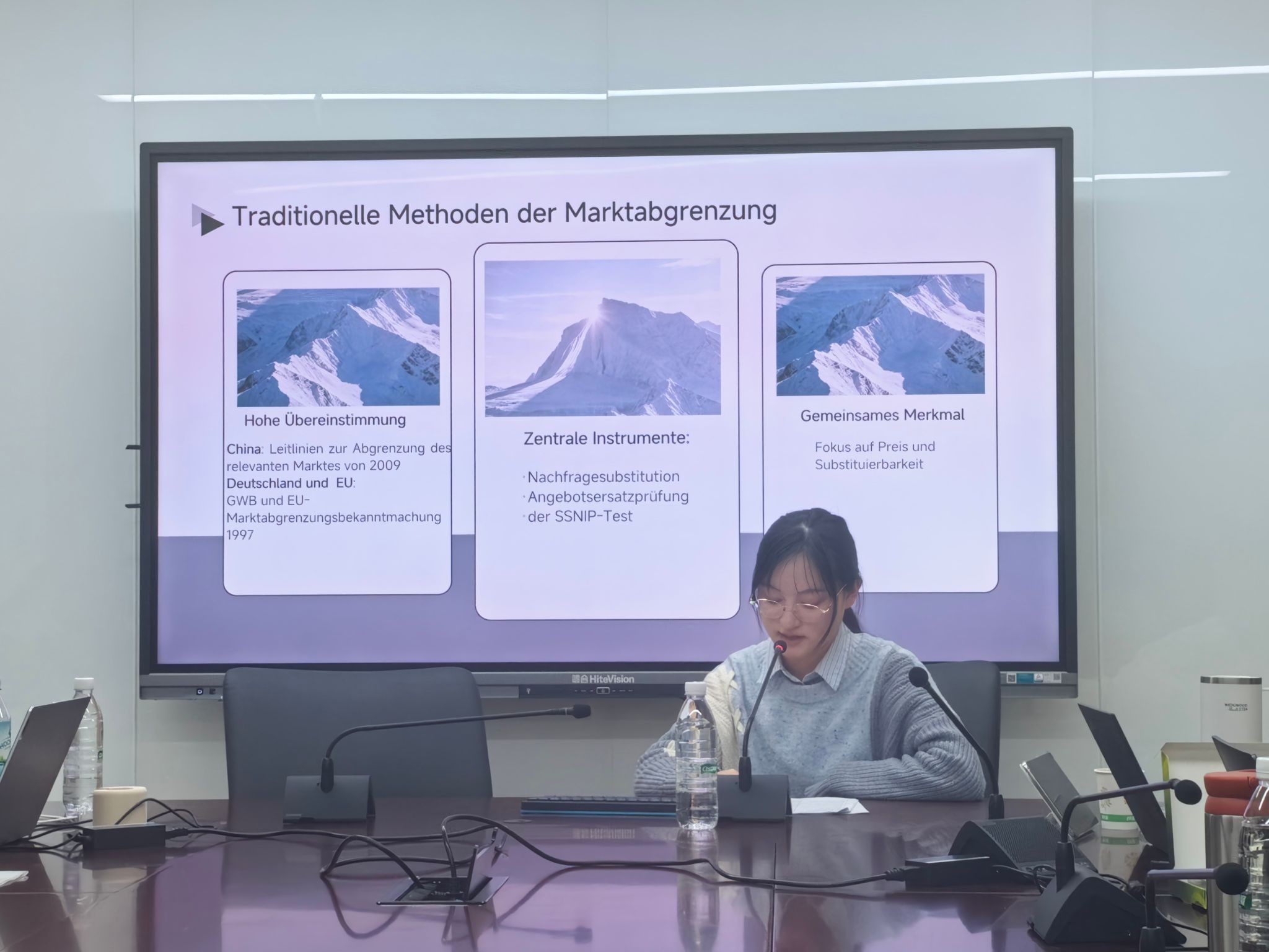 第二位报告人是徐湘宜同学,她的报告题目是《德国与中国反不正当竞争法中的保护目的》。徐湘怡指出,两国法律虽在规范层面均确立了保护竞争者、消费者与竞争秩序的三重目标,但在司法实践中呈现出深刻差异:德国法通过动态的利益权衡方法,在具体个案中对多重保护目标进行综合考量;而中国司法实践仍在一定程度上受侵权法思维路径依赖的影响,倾向于从经营者利益受损角度直接推定行为不正当性。