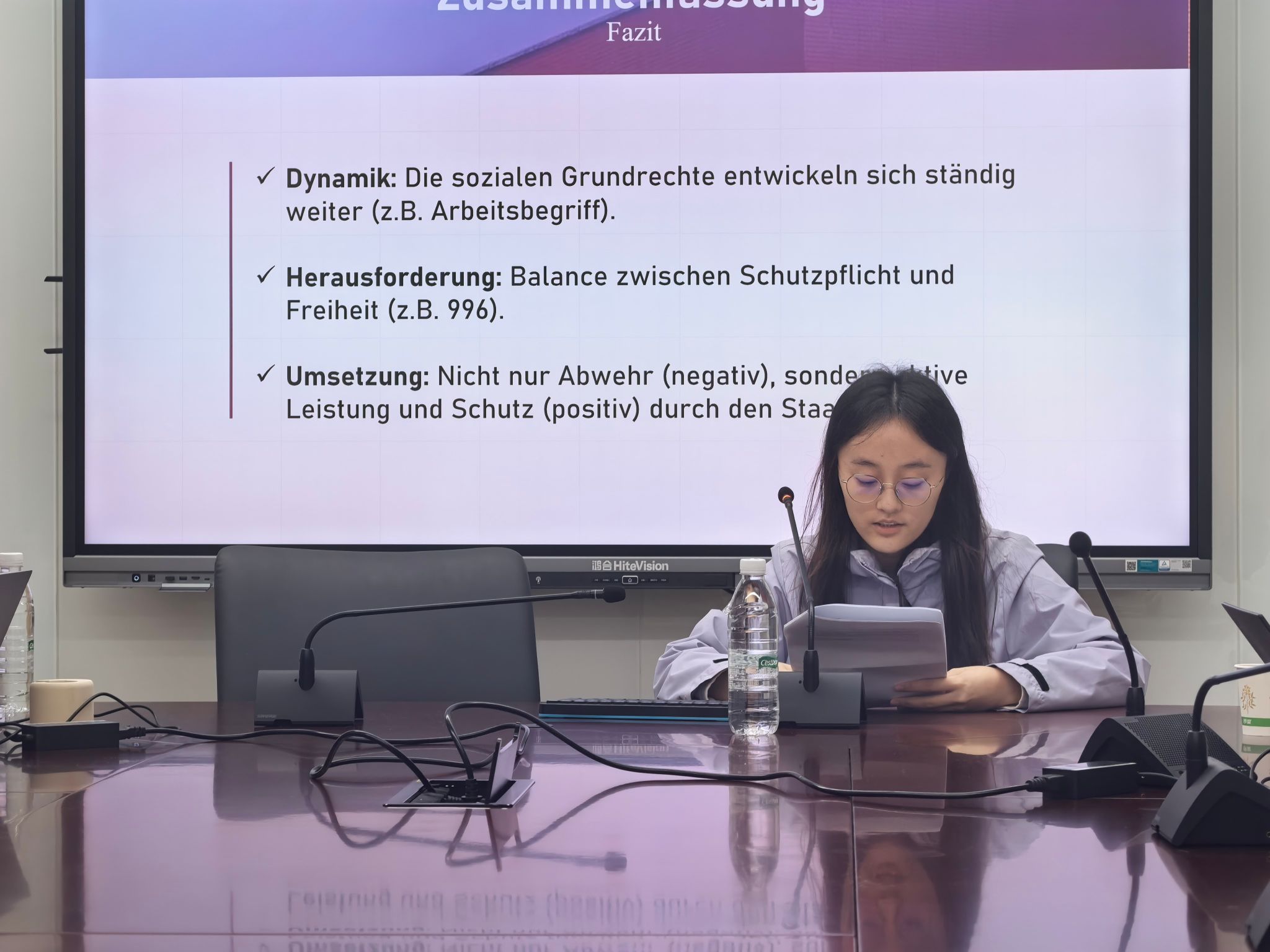 第一位报告人是吕应涛同学,她报告的题目是《中国宪法体系中的社会基本权利》,分为理论框架、具体权利分析与总结三部分。她主要谈到社会权利与自由权利不同,要求国家承担积极保护与给付义务。具体涵盖四项核心权利:劳动权随经济改革拓展内涵,区分宪法与劳动法适用范围;休息权面临“996”工作制争议,需平衡劳动者保护与企业自由;社会保障权已从福利转化为法定权利;受教育权因齐玉苓案引发宪法可诉性争议,现通过间接适用发挥作用。这些权利的实现,依赖国家积极履行保护与给付义务,处于动态发展中。