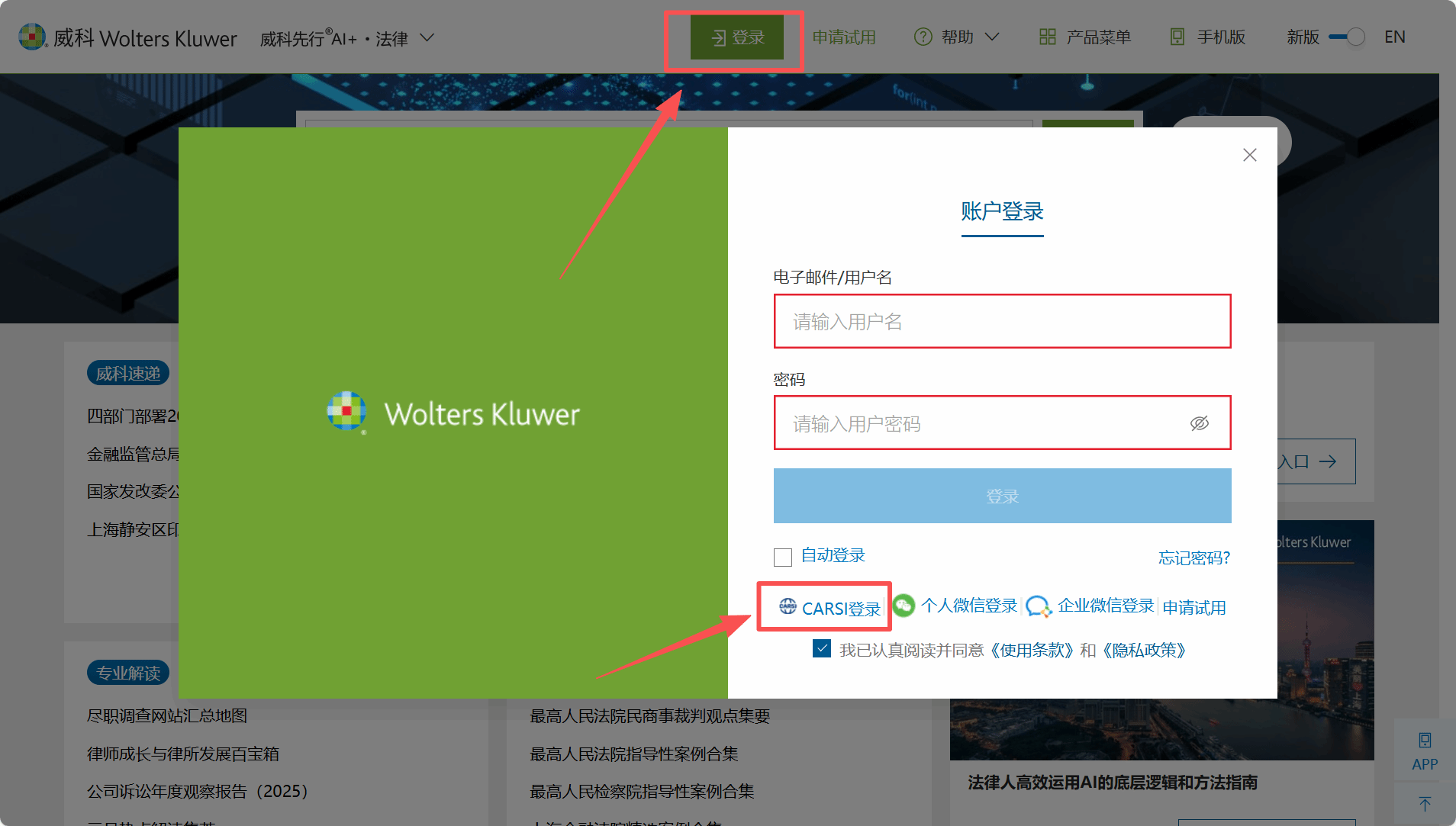 Step 1:输入威科先行法律信息库链接://law.wkinfo.com.cn,点击页面中的登录,选择“CARSI登录”。