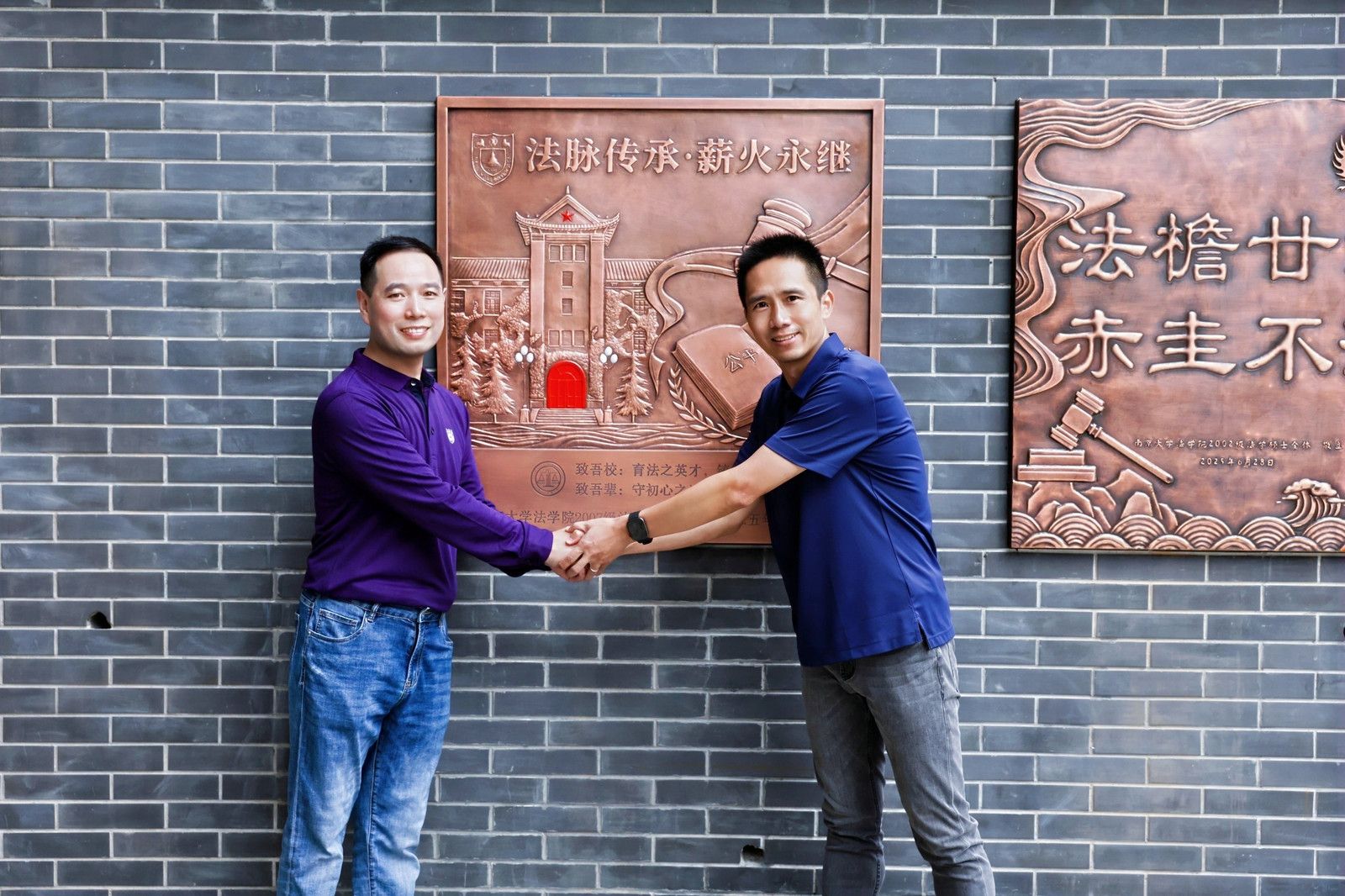 杨阳副院长与07法硕同学代表陈玉峰共同为“07法硕毕业十五周年”纪念铜牌揭幕,这块铜牌是对青葱岁月的致敬,更是对色情网站