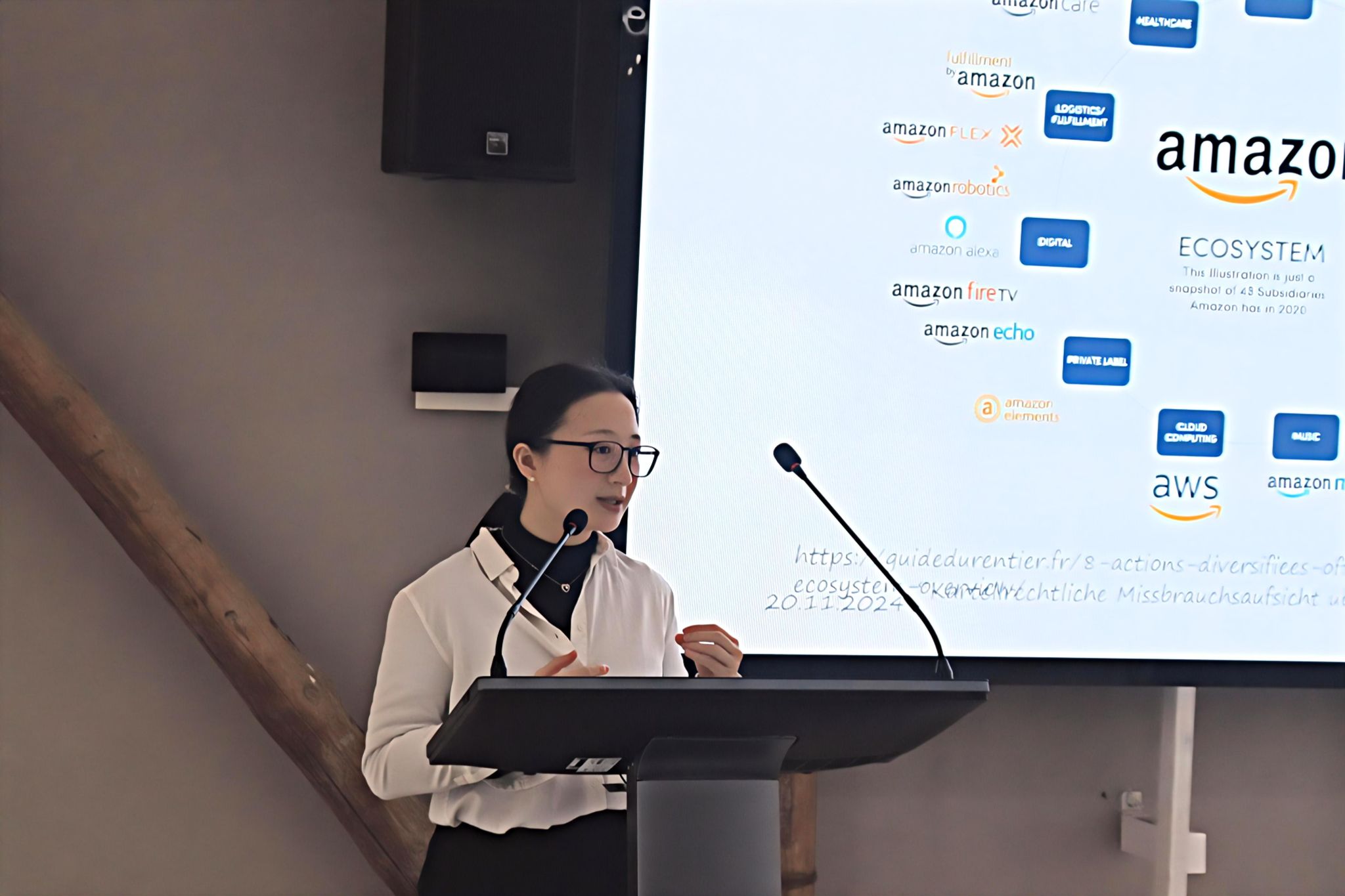 -哥廷根大学中德法学研究所学术助理张冉苓以《德国反限制竞争法框架下对网络多边平台的滥用规制——以亚马逊为例》为题作报告。报告认为,数字多边平台具有其特殊性,其价值链条不同于传统经营者。此外,数字多边平台的规制需要考虑其动态性与创新性。德国竞争法突破了传统的滥用监管,规制相对优势市场的平台力量,审查亚马逊通过价格控制机制或算法对平台商家价格可能施加的影响,以及审查平台在销售品牌产品准入上潜在的不公平待遇。德国《数字市场法》(DMA)与《反限制竞争法》(GWB)第19a条为全面监管网络多边平台,认定相对优势市场力量提供了参考,特别是注重数据在网络多边平台监管中的辅助作用,值得借鉴。