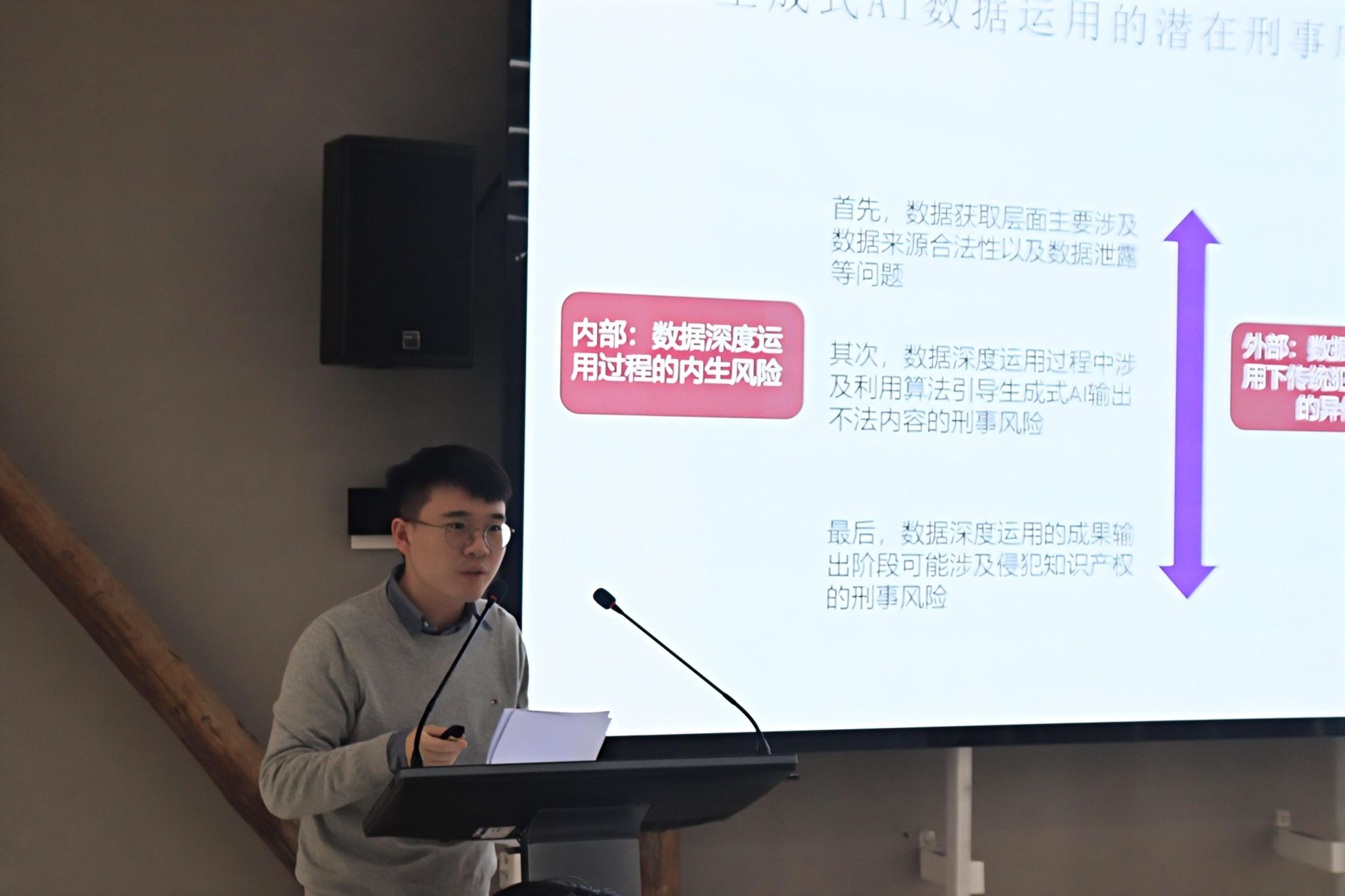 博士研究生章诚豪以《生成式AI时代数据犯罪治理的审视与新思路》为题作报告。他认为,生成式AI运用大数据资源,使得数据的非法运用概率增加存在数据泄漏、算法歧视等潜在风险。因此,生成式AI治理路径应当进行逻辑更新与重心调适。数据安全秩序应属于数据犯罪罪名的阻挡层法益,背后层法益仍然应回归至具体利益(国家法益、社会法益)或私法益(个人法益)。报告人提出了生成式AI时代数据犯罪治理体系的阶层式结构,强调应综合运用传统刑法解释学、行政规制手段与自治力量对数字经济风险予以全方位的法律应对。