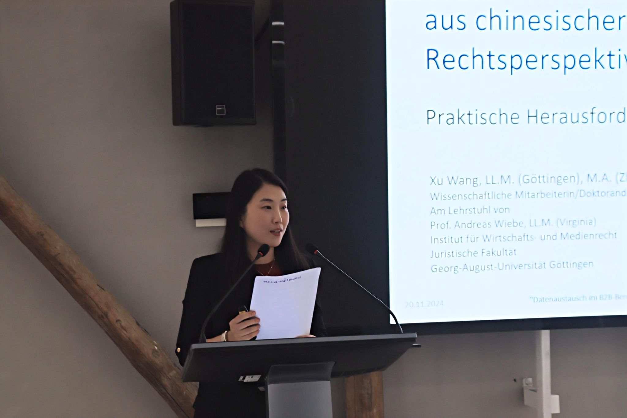 哥廷根大学法律系学术助理王旭以《中德法律视角下B2B领域的数据共享:现实挑战与法律困境》为题作报告。数据交换是不同的市场参与者借助中介利用或复用数据的一种共通的数据使用方式。本报告的讨论对象主要限于B2B领域中非人身数据的交换。报告人介绍了《欧洲联盟运作条约》(AEUV)与《数据法案》(Data Act)中对数据的界定、权利义务设定,并展示了中国《民法典》与《中共中央、国务院关于构建数据基础制度更好发挥数据要素作用的意见》中数据确权的可能与路径。报告人强调,应当弱化数据权利的独属性,以建设自由的数据市场,促进数据流通适用,维护参与各方的合同自由。